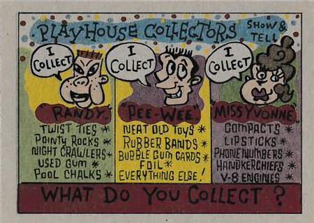 These cards were included in the Topps "Pee Wee's Playhouse Fun Pack" card packages that, in general, included: 1 tattoo sheet, 3 picture cards, 1 sticker, 1 wiggle toy, and 1 activity card.  This series of cards are photographs of Pee Wee and his friends with their on-camera surroundings.  The backs of 18 of the cards are puzzle pieces with the remaining 15 being single feature cartoons.