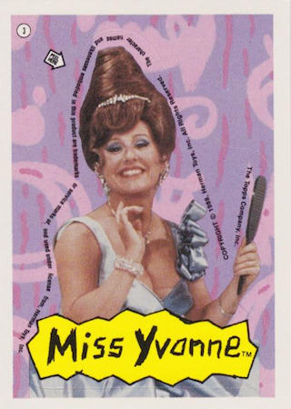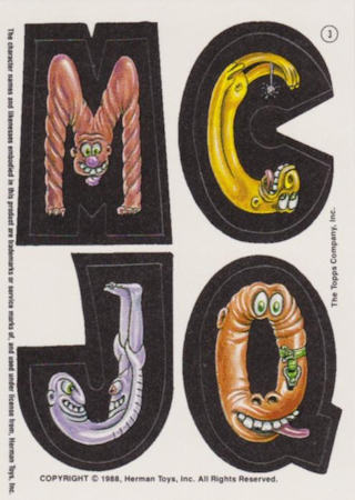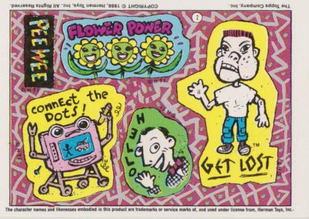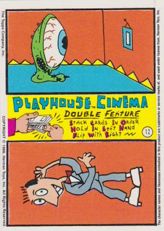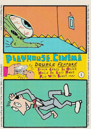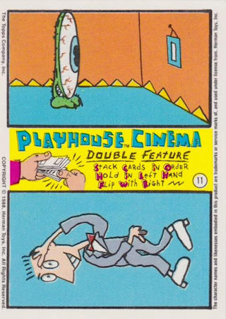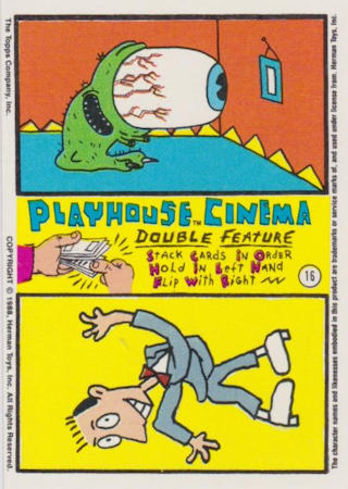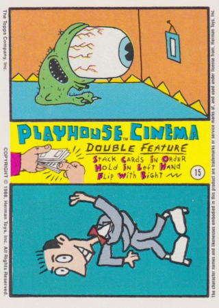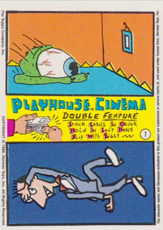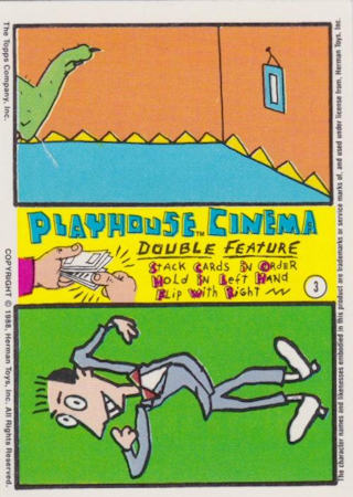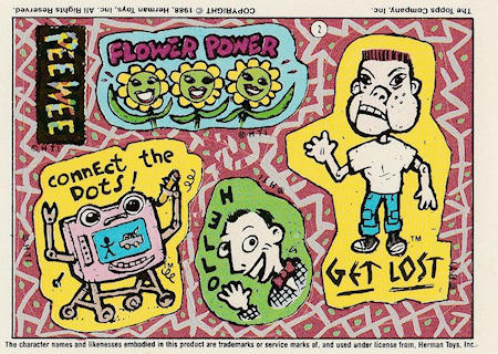 These cards were included in the Topps "Pee Wee's Playhouse Fun Pack" card packages that, in general, included: 1 tattoo sheet, 3 picture cards, 1 sticker, 1 wiggle toy, and 1 activity card.  This series of cards are double-imaged items designed to be used a flip books.  The first 40 cards are numbered with the remaining four cards being unnumbered checklists.  The backs of the cards contain numbered sticker sheets with three different themes: nutty initials, characters, and miniature pictures/slogans.  It should be noted that there are only 22 different stickers.