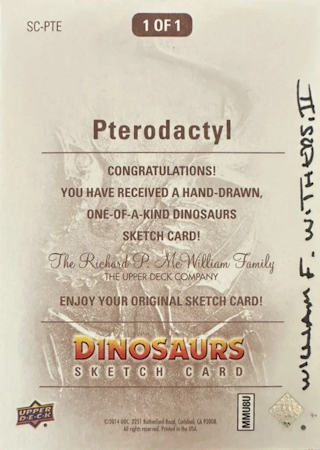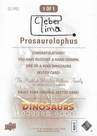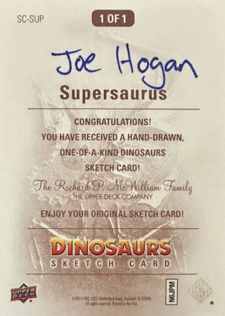 These "one-of-a-kind" artist cards were randomly inserted into Hobby boxes of Upper Deck Dinosaurs cards at a rate of about one per box.  There are 50 different subjects (i.e., dinosaurs, other extinct reptiles, extinct mammals).