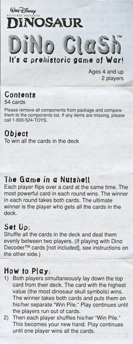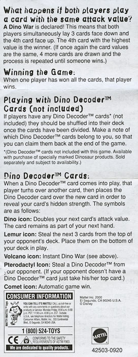 These cards make up the Dinosaur Dino Clash Game which is essentially a card battle game based on the number of 'skulls' on each card.   An interesting and somewhat devious (from a sales perspective) feature of this game is the optional use of 'decoder' cards which are NOT included with the game (see separate Mattel listing in this site).  These decoder cards expose hidden symbols (i.e., dino, lemur, volcano, pterodactyl & comet) which provide game power-ups but the cards were only available inside packages of specially marked Disney Dinosaur toys.