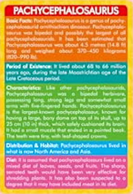 These cards were packaged with plastic dinosaur toys.  Kudos to the manufacturer for including cards but this is one of those sets that give Chinese import products a poor reputation.  Most of the figures are bland and generic but that is probably OK given the demographic for these toys are young kids but the images on the cards are mess.  For examples, the Allosaurus looks like a quadruped carnivor with large arms (front legs?), the Brachiosaurus doesn't have the large identifing "bump" (nasal openings) on its head, the Giganotosaurus, a massive theropod, looks like a Therizinosaurus, and then there is the Pachycephalosaurus …. what the heck is that?