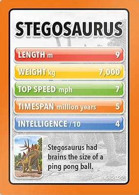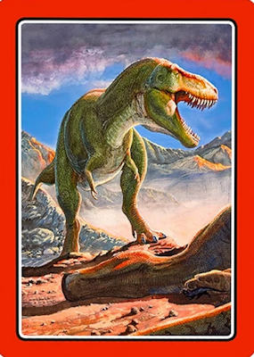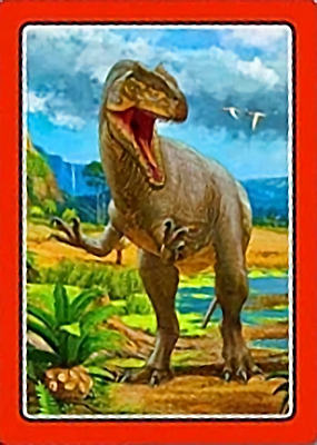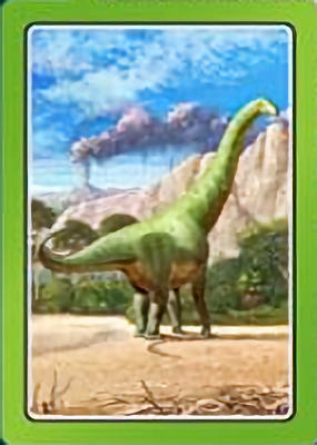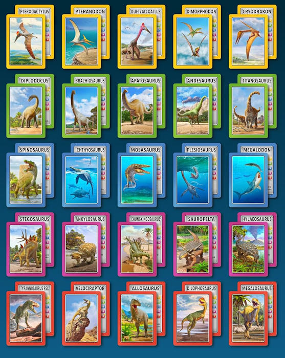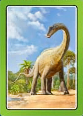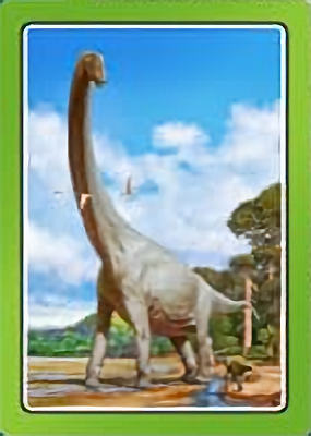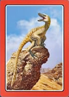 These cards comprise the 'Smart Cards Dinosaurs' deck which can be used in seven different games including Trumps, Rummy, Happy Families, and Snatch.   There are 25 cards with images of different dinosaurs (prehistoric animals) pictured on them, each of which has color-coded borders as differentiation between animal types; aquatic, armored, 'Gentle Giants' (i.e., large quadrupeds), winged animals, and carnivores.