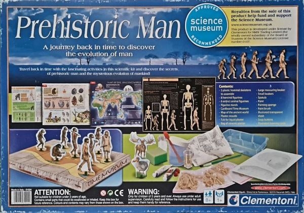 The pieces are components of an activity kit focused on the presumed evolution of man.  There a eight hominid standup figures, six extinct animals standup figures, three plastic hominid skeletons, and a variety of other educational and craft components.