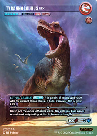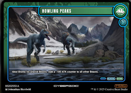 These are the cards used to play the Zoic Trading Card Game and include dinosaurs, extinct mammals, dragons, human warriors, armament, and biomes (environments) to name a few.  The creation of this game was funded through Kickstarter and is expected to ship in May 2026.