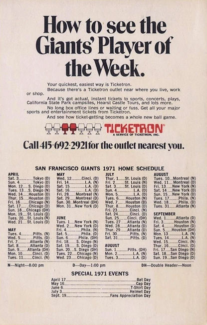 1971   Ticketron   San Francisco Giants Schedule Cards