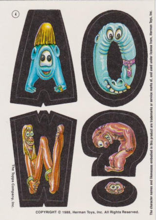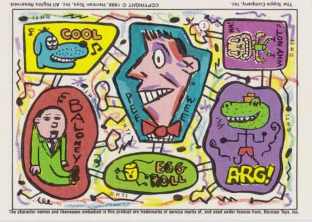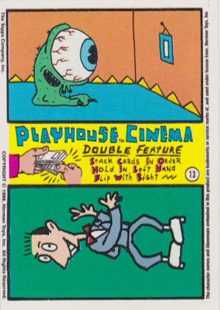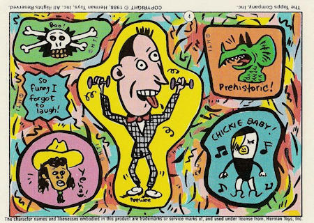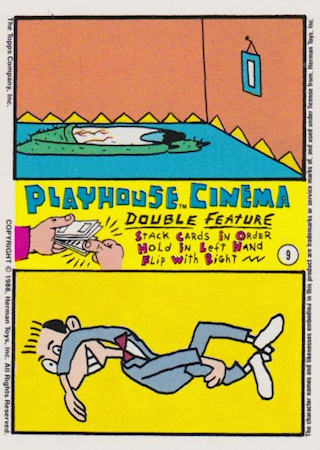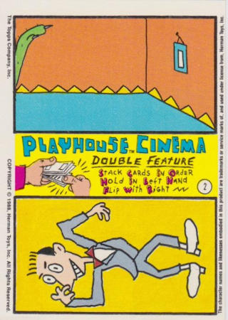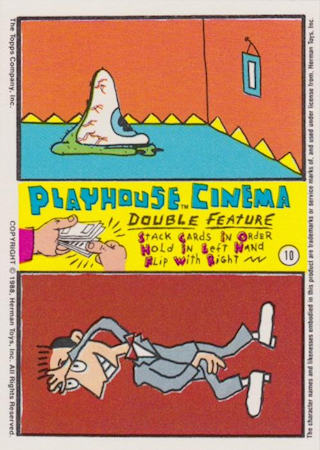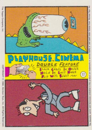 These cards were included in the Topps "Pee Wee's Playhouse Fun Pack" card packages that, in general, included: 1 tattoo sheet, 3 picture cards, 1 sticker, 1 wiggle toy, and 1 activity card.  This series of cards are double-imaged items designed to be used a flip books.  The first 40 cards are numbered with the remaining four cards being unnumbered checklists.  The backs of the cards contain numbered sticker sheets with three different themes: nutty initials, characters, and miniature pictures/slogans.  It should be noted that there are only 22 different stickers.