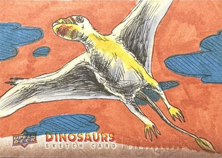 These "one-of-a-kind" artist cards were randomly inserted into Hobby boxes of Upper Deck Dinosaurs cards at a rate of about one per box.  There are 50 different subjects (i.e., dinosaurs, other extinct reptiles, extinct mammals).