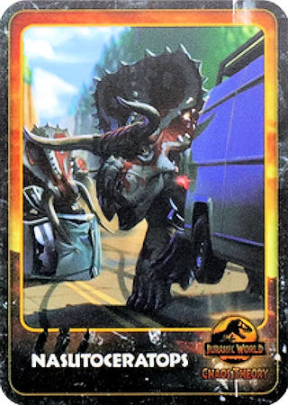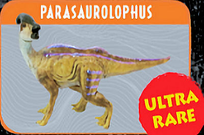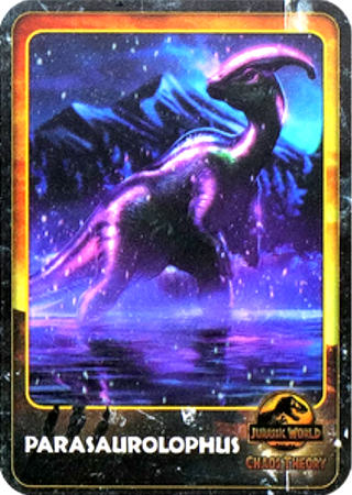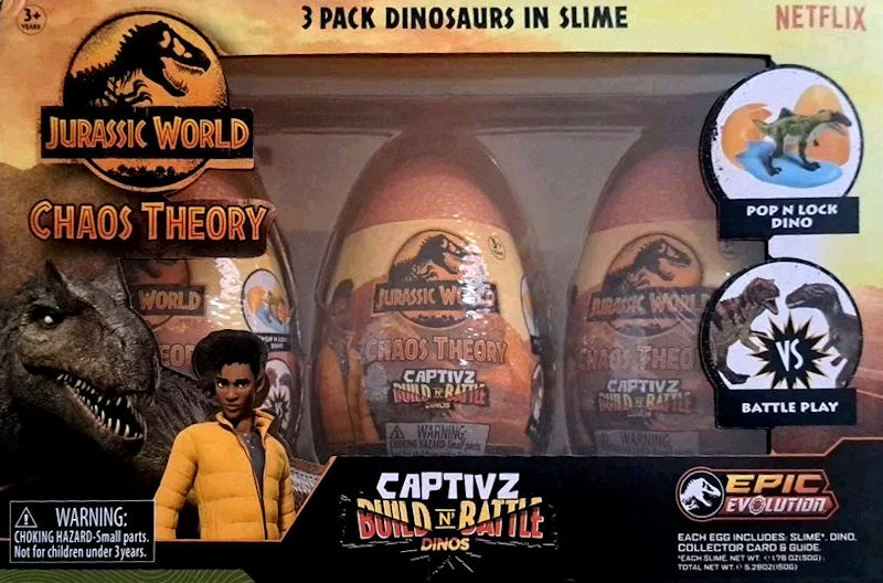 These cards were included inside Captivz Jurassic World Chaos Theory plastic slime eggs which also included a 'Pop 'n Lock' toy, a slime pack, and collector foldout toy line guide.  The Parasaurolophus figure is advertise as being 'rare' and "luminescent" (glow in the dark).