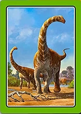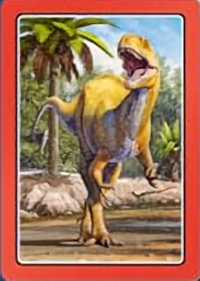 These cards comprise the 'Smart Cards Dinosaurs' deck which can be used in seven different games including Trumps, Rummy, Happy Families, and Snatch.   There are 25 cards with images of different dinosaurs (prehistoric animals) pictured on them, each of which has color-coded borders as differentiation between animal types; aquatic, armored, 'Gentle Giants' (i.e., large quadrupeds), winged animals, and carnivores.