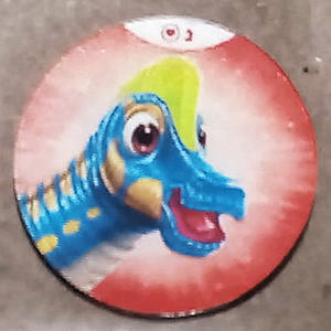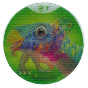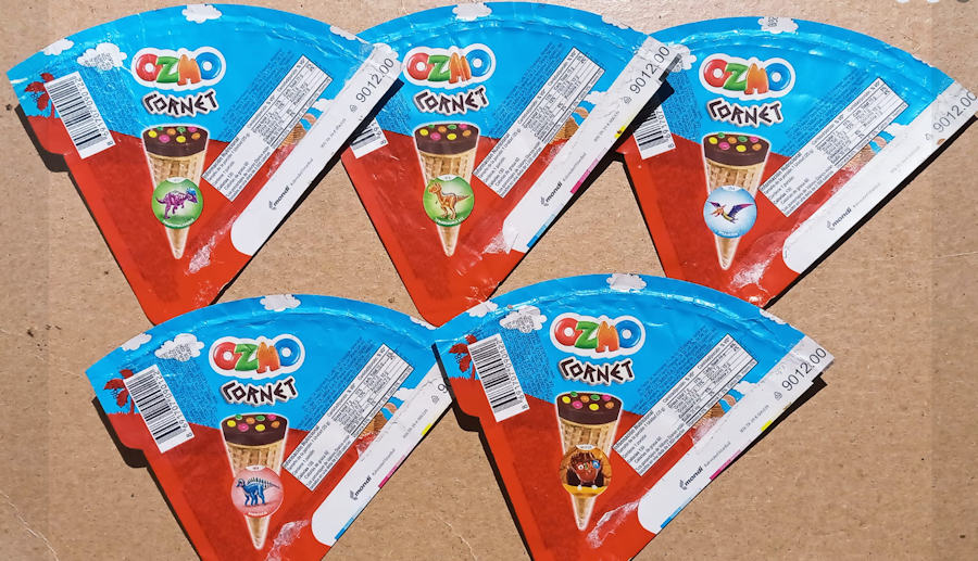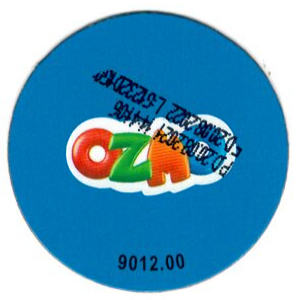 These POGS were inserted in individual Ozmo Cornet ice cream cones. There were three separate sets consisting of 10 POGS each.  Each set has a different color background (i.e., blue, green, red).  There are at least four different background colors on the reverse of the POGS which most likely relate to the packaging of each ice cream/cone flavors.