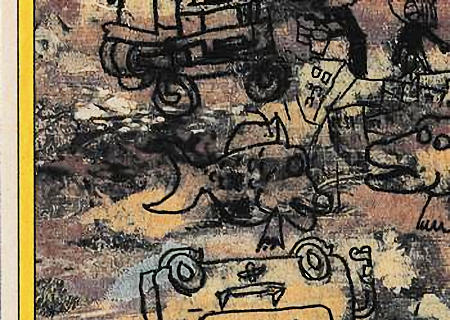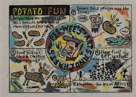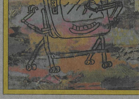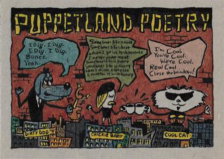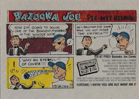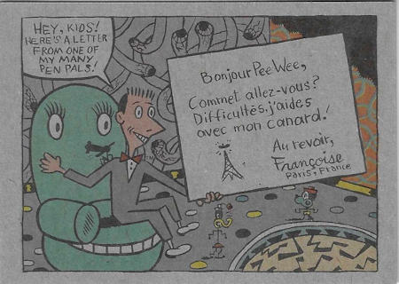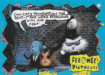 These cards were included in the Topps "Pee Wee's Playhouse Fun Pack" card packages that, in general, included: 1 tattoo sheet, 3 picture cards, 1 sticker, 1 wiggle toy, and 1 activity card.  This series of cards are photographs of Pee Wee and his friends with their on-camera surroundings.  The backs of 18 of the cards are puzzle pieces with the remaining 15 being single feature cartoons.