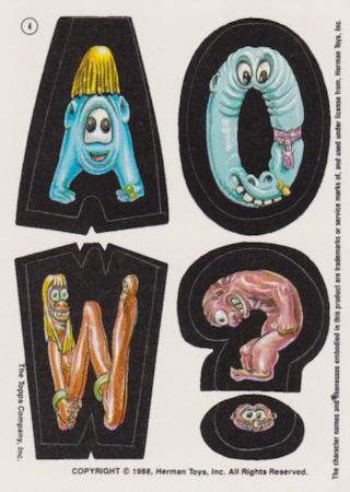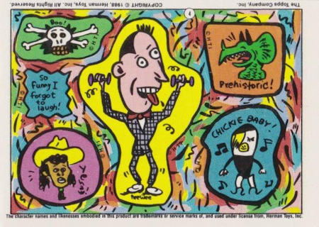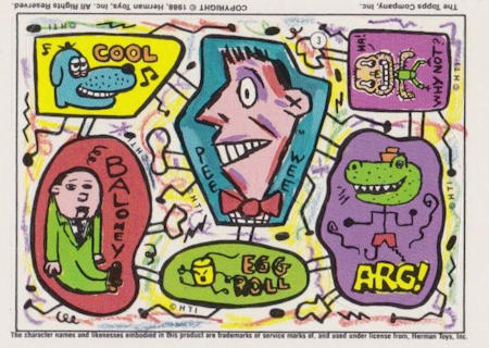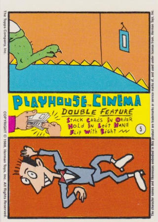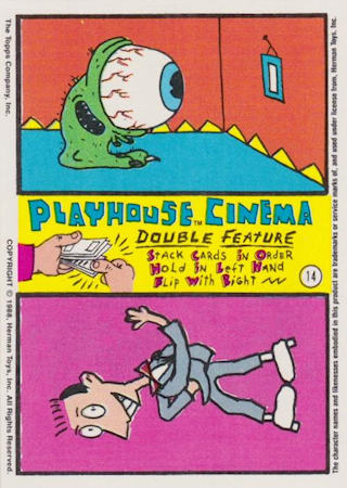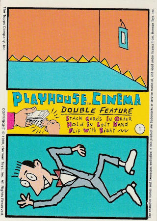 These cards were included in the Topps "Pee Wee's Playhouse Fun Pack" card packages that, in general, included: 1 tattoo sheet, 3 picture cards, 1 sticker, 1 wiggle toy, and 1 activity card.  This series of cards are double-imaged items designed to be used a flip books.  The first 40 cards are numbered with the remaining four cards being unnumbered checklists.  The backs of the cards contain numbered sticker sheets with three different themes: nutty initials, characters, and miniature pictures/slogans.  It should be noted that there are only 22 different stickers.