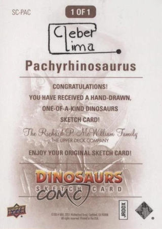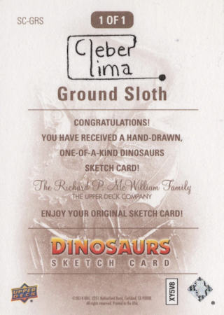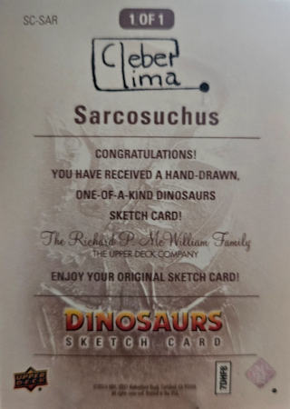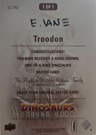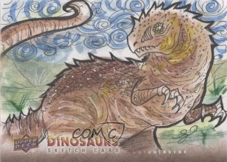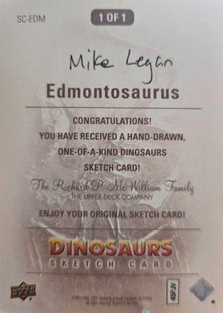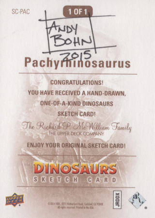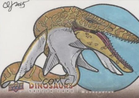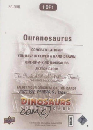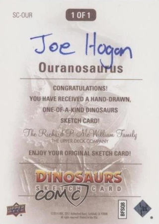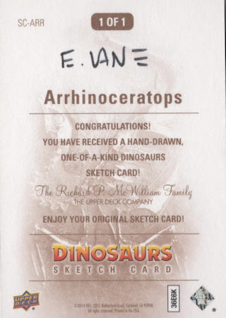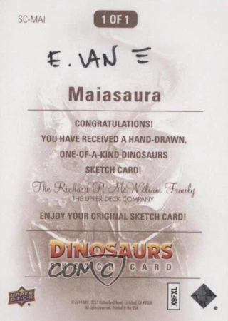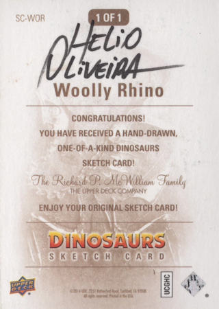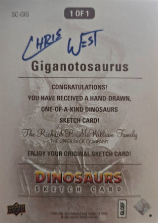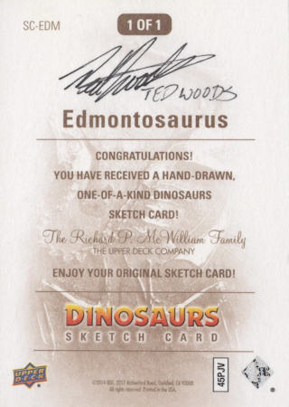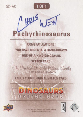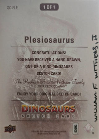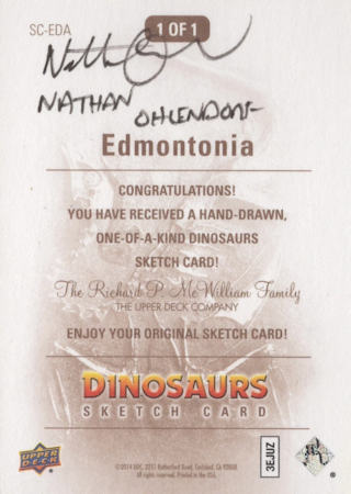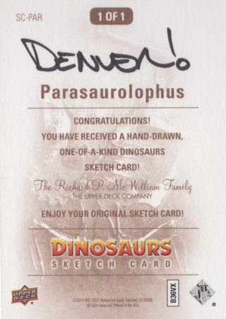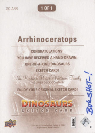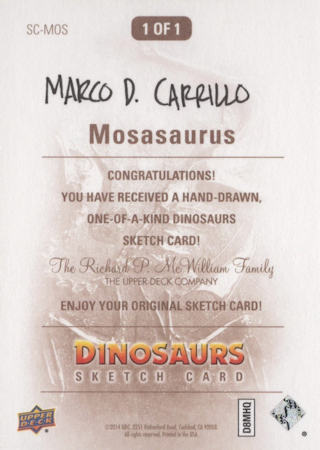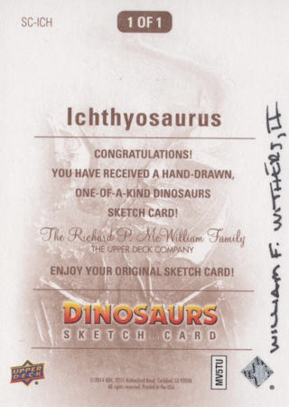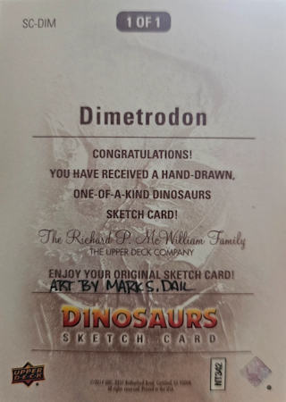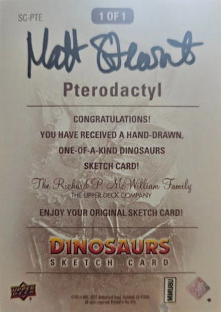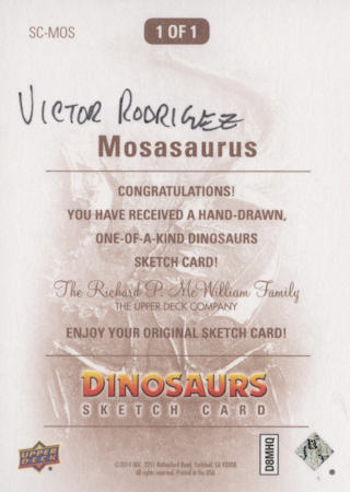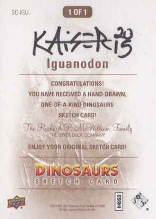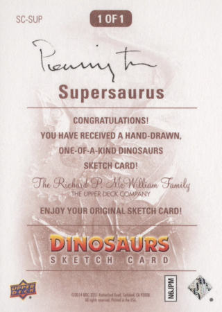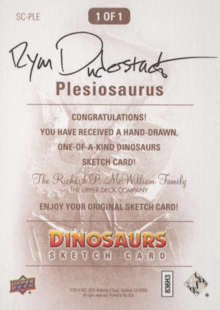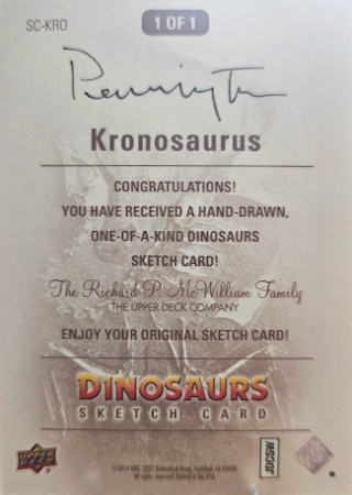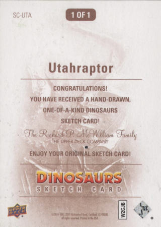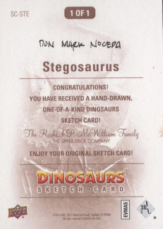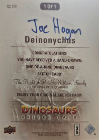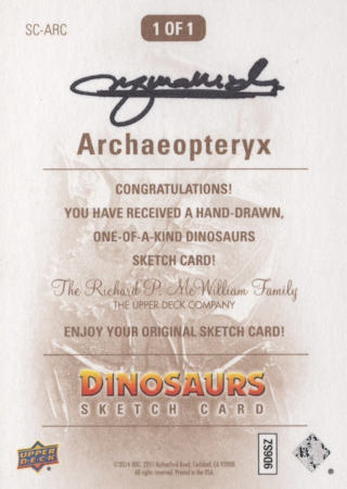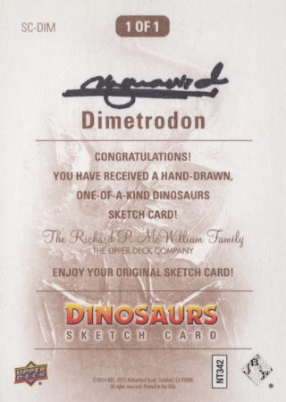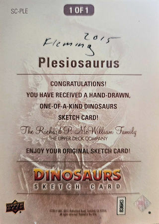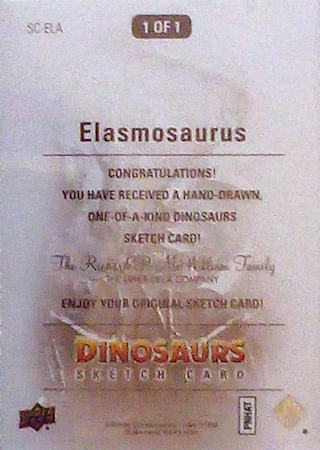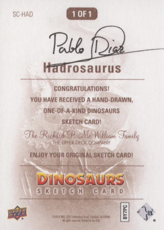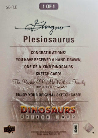 These "one-of-a-kind" artist cards were randomly inserted into Hobby boxes of Upper Deck Dinosaurs cards at a rate of about one per box.  There are 50 different subjects (i.e., dinosaurs, other extinct reptiles, extinct mammals).