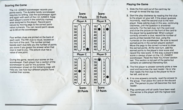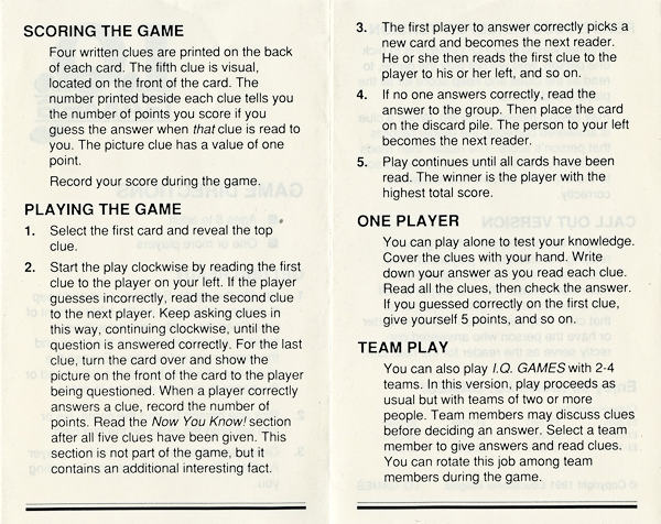 NOTE: the front of the 1989 box says, "Starter Set" and the side panel states, "… Other packs with fascinating information are available for learning fun!"  I do not know if this means there were additional dinosaur quiz card packs available or if it alludes to other I.Q. Games topics (e.g., Animals of the World, World Geography, U.S. Presidents, Sports & Games, World History, etc.).