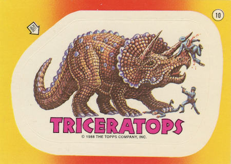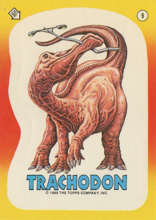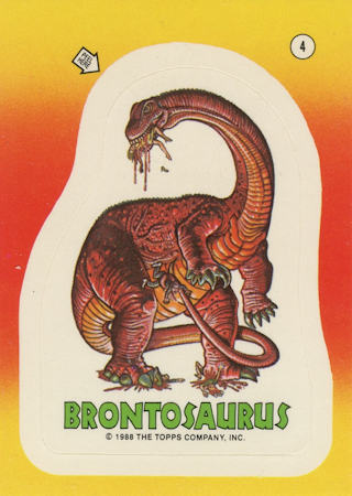 Dinosaurs Attack! is sort of a retro set borrowing its creative flavor from the classic Mars Attack! set produced by Bubbles, Inc. (a.k.a. Topps) in 1962.  The artwork is provided by a handful of renowned comic artists.  These stickers were inserted in packs of Dinosaurs Attack!  Whether because of the gratuitous gore or perhaps the subject matter in general, sales never came close to Topps expectations which is why this set is still relatively easy to obtain.