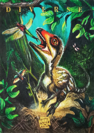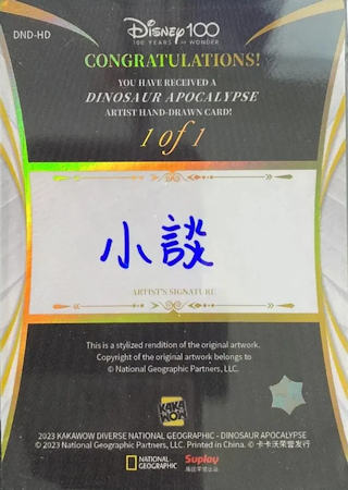 These are hand-drawn artist cards which were randomly inserted in boxes and packs of Kakawow Diverse Dinosaur Apocalypse collector cards.