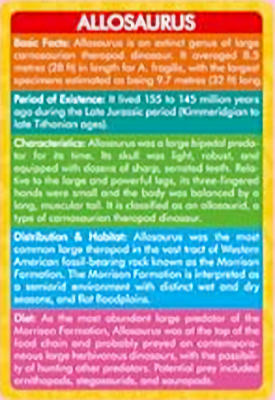 These cards were packaged with plastic dinosaur toys.  Kudos to the manufacturer for including cards but this is one of those sets that give Chinese import products a poor reputation.  Most of the figures are bland and generic but that is probably OK given the demographic for these toys are young kids but the images on the cards are mess.  For examples, the Allosaurus looks like a quadruped carnivor with large arms (front legs?), the Brachiosaurus doesn't have the large identifing "bump" (nasal openings) on its head, the Giganotosaurus, a massive theropod, looks like a Therizinosaurus, and then there is the Pachycephalosaurus …. what the heck is that?