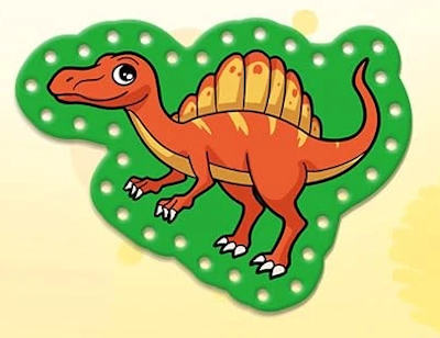 These are single-sided lacing cards in the shapes of dinosaurs designed for young children.