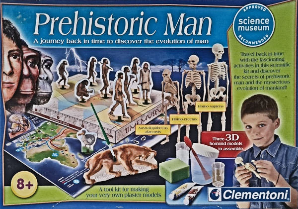 The pieces are components of an activity kit focused on the presumed evolution of man.  There a eight hominid standup figures, six extinct animals standup figures, three plastic hominid skeletons, and a variety of other educational and craft components.