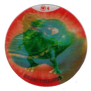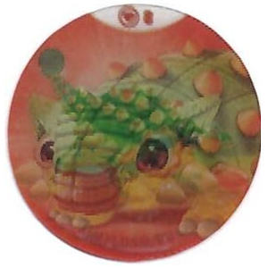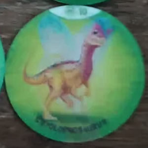 These POGS were inserted in individual Ozmo Cornet ice cream cones. There were three separate sets consisting of 10 POGS each.  Each set has a different color background (i.e., blue, green, red).  There are at least four different background colors on the reverse of the POGS which most likely relate to the packaging of each ice cream/cone flavors.