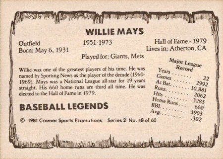 1981   Cramer Sports Promotions   Baseball Legends (Series 2)