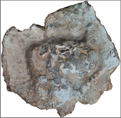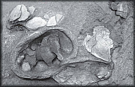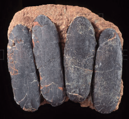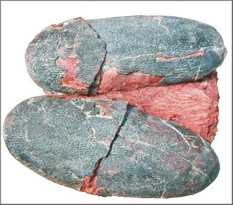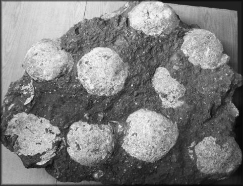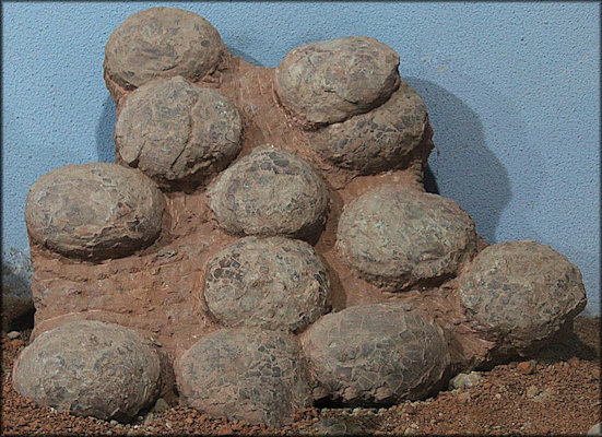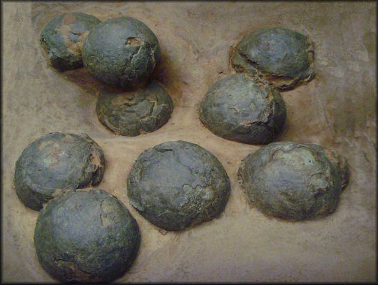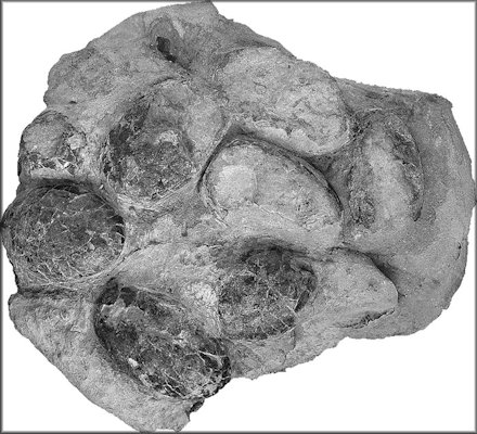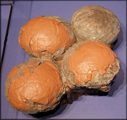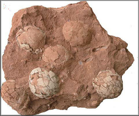 Fossilized remains of eggs laid by ancient animals including vertebrates and invertebrates.